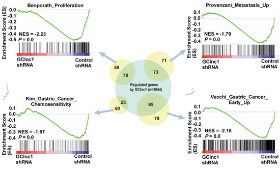 为了进一步探究GClnc1和胃癌的关系,作者做了一系列的生物信息学分析以及功能性实验。作者先将GClnc1敲除,然后借助RNA-seq来筛选GClnc1可能调控的基因。通过RNA-seq找到异常表达的基因后进行基因集富集分析(GSEA),发现GClnc1调控的基因中大部分都是癌相关基因,比如c-MYC和CDK1等。同时,功能性实验也证明GClnc1可以促进癌细胞的增殖和入侵,最后促进胃癌的发生。