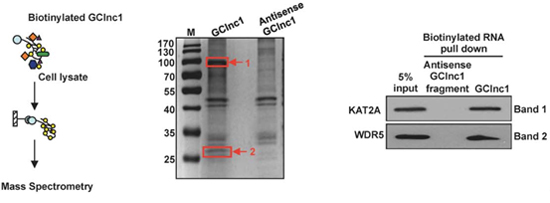 lncRNAs可以通过和转录因子或者其他细胞因子结合来发挥功能。为了探究GClnc1具体的作用机制,作者利用RNA pull down实验和质谱来寻找GClnc1可能结合的蛋白。通过质谱实验,作者鉴定了近200个蛋白,同时选取了其中的10个和转录调控相关的蛋白进行WB验证。结果发现,只有蛋白WDR5和KAT2A可以和GClnc1特异性结合,其中WDR5是H3K4甲基转移酶,而KAT2A是H3K9乙酰转移酶。接下来,作者利用siRNA和RIp实验进一步证明了GClnc1可以特异性和蛋白WDR5以及KAT2A结合形成复合物。