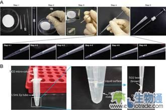 图 2. 基于 StageTip 的自制 TiO2 萃取小柱制作流程(A、采用 C8 反向填料膜片制作 C8 StageTip 小柱,此图片来自文献[8];B、在 C8 小柱上加入适量的 TiO2 beads 用于富集磷酸化肽段。使用顶端挖孔的 1.5 mL Ep 管作为 TiO2 萃取小柱的离心装置,此配置能保证加入 200 µL 流动相后,TiO2 萃取小柱不会离心离干)