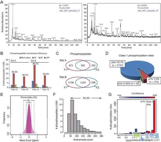 图 3. 自制 TiO2 萃取小柱富集胰岛样品的磷酸化肽段(A、胰岛样品富集2次后得到的磷酸化肽段分别进行 LC-MSMS 分析,图中所展示为 MS1 的 TIC 谱图;B、两只大鼠的磷酸化肽段鉴定结果;C、胰岛样品富集 2 次后得到的每个组分的磷酸化肽段的重合情况;D、丝,苏,酪氨酸磷酸化位点分布统计,这里仅统计了一类位点;E、所有鉴定的肽段的质谱测量质量偏差分布;F、所有鉴定的磷酸化肽段的搜索引擎(Andromeda)打分分布;G、所有鉴定的磷酸化位点的定位概率分布)