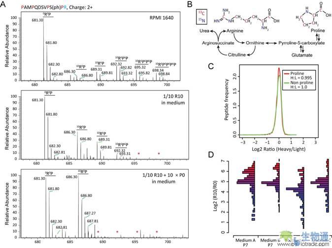 图4. 调整 SILAC 培养基的成分比例消除精氨酸-脯氨酸转化(A、举例,含有 4 个脯氨酸的一条肽段的一级质谱;B、哺乳动物细胞中精氨酸、脯氨酸相互转化的代谢通路;C、含有脯氨酸与不含有脯氨酸的肽段的定量分布曲线;D、不同 SILAC 培养条件下 INS-1E 细胞的标记效率)