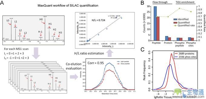 图 5. 大鼠胰岛的全蛋白质组和磷酸化蛋白质组 SILAC 定量结果(A、MaxQuant 进行 SILAC 定量时的工作流程;B、大鼠胰岛的全蛋白质组和磷酸化蛋白质组鉴定,定量结果统计;C、大鼠胰岛的全蛋白质组和磷酸化蛋白质组定量分布曲线)