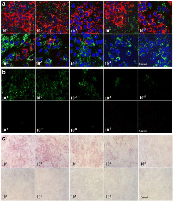 Fig. 1 a CSFV ViewRNA ISH反应灵敏度。靶基因CSFV RNA 显示红色亮点,内参β-actin显示绿色亮点,DApI染核显示蓝色区域。b CSFV FAT反应灵敏度。c CSFV IHC反应灵敏度。都使用没有被病毒感染的阴性细胞样品作为对照。