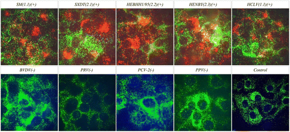 Fig. 2 CSFV ViewRNA ISH反应特异性。红色荧光代表CSFV RNA阳性信号,绿色荧光代表β-actin信号;使用没有被病毒感染的阴性细胞样品作为对照;“+”代表结果阳性,“-”代表结果阴性。