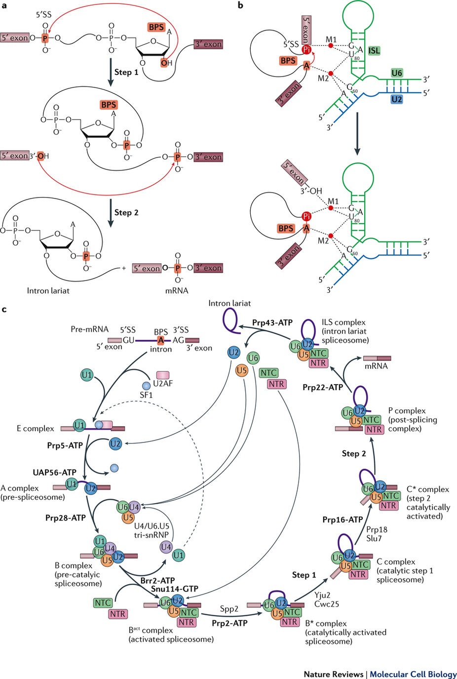 在p complex中,步骤II剪接因子prp17, prp18和Slu7仍结合在活性位点附近。剪接因子Cwc21和Cwc22一起稳定了外显子。ATp酶/解螺旋酶prp22位于高度不对称的p complex的一个角落,主要与prp8的Lingker结构域相互作用。连接的外显子锚定在U5 snRNA的loop上,保守的3’-拼接位点(3 ‘SS)的AG二核苷酸则坐落于活性位点。