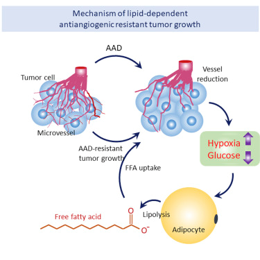 肿瘤血管的减少导致肿瘤组织出现低氧化,这一过程被称为hypoxia,也就是缺氧。研究人员发现缺氧是触发肿瘤组织周围或内部的脂肪细胞降解过量脂质分子的启动器,这些脂质能量分子可以在血液供应不足时用于癌症组织扩张。