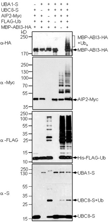 利用二重表达载体,在原核表达载体中共表达了拟南芥泛素单体(Ub)、泛素化底物(ABI3)与E1、E2、E3(AIp2)。