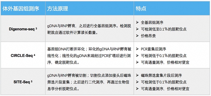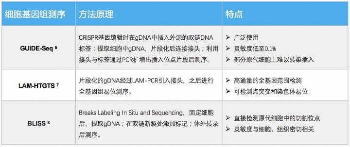 对被CRISpR基因编辑过的细胞进行基因组测序,使得实验不局限于RNp系统,也可检测特定条件下的特定细胞。但是这种检测方式的灵敏度与实验方式、细胞类型等有关。常见的方法详见表3: