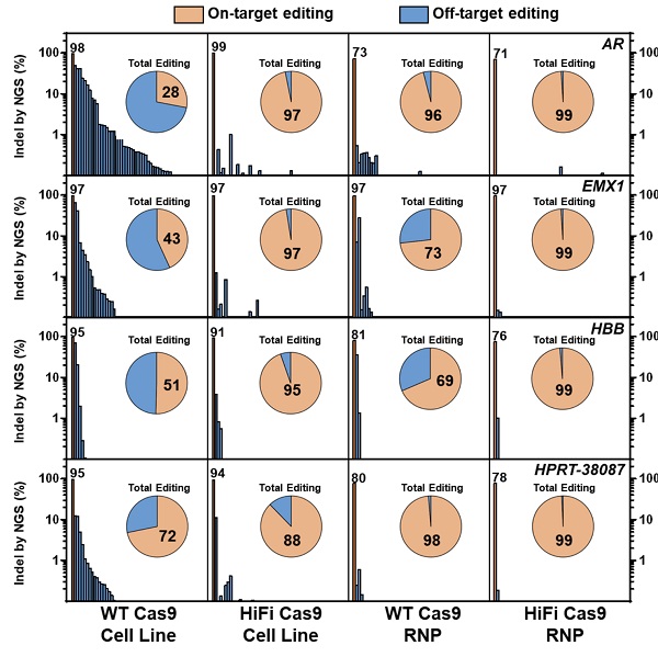 而Alt-R S.p. HiFi Cas9的RNp形式或以其构建的稳转细胞系(图3,第二列和第四列),脱靶比例都显著低于野生型(图3,第一列和第三列)。HiFi Cas9 RNp形式的脱靶效率则是最低的:在四个测试基因中都有高达99%的中靶率(图3,第四列)10。
